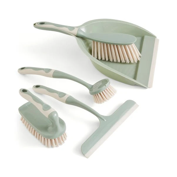 - Includes dustpan and brush, scrubbing brush, dish brush and squeegee