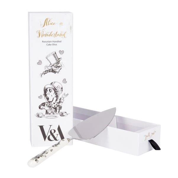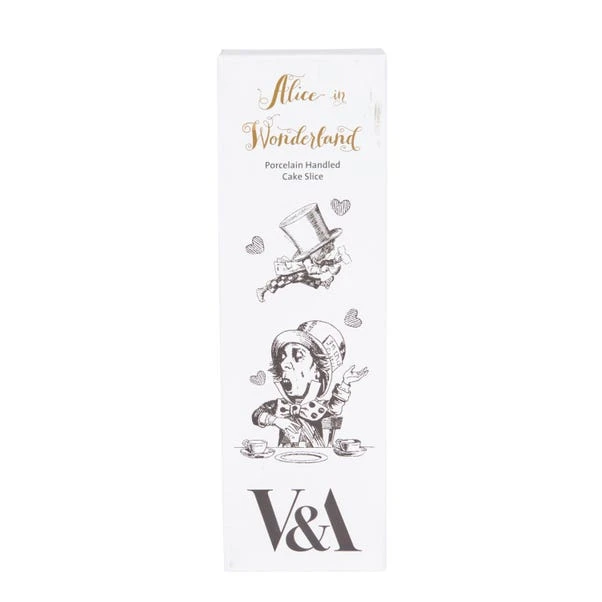 Serve up a slice of Wonderland with this charming Alice in Wonderland cake slicer. Featuring vintage designs from the V&A archives, it’s decorated with illustrations from a classic Alice card game, including the iconic “We’re all mad here” quote. Made from rust-resistant stainless steel with a pretty porcelain handle, it’s not only practical but a delightful addition to your kitchen. The wide blade and serrated edge make slicing cakes and pies a breeze, while the elegant V&A packaging, complete with a ‘Pull Me’ tab, means no wrapping needed. Pair it with matching Alice tableware and drinkware for the perfect afternoon tea set. A wonderful treat for yourself or a thoughtful gift for a fellow Wonderland fan.
