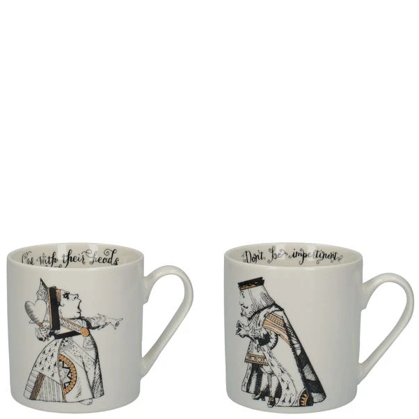Add a touch of whimsy to your tea time with this delightful Set of 2 Alice in Wonderland mugs. Featuring vintage illustrations from the V&A Museum archive, each mug brings the iconic King and Queen of Hearts to life in stunning detail. With classic quotes on the inner rims, these fine China mugs offer a dash of luxury, complete with beautiful golden highlights. Packaged in a charming V&A gift box, they make the perfect gift for a fun-loving couple or any Alice fan. Why not complete the set with matching Alice in Wonderland tea cups, saucers, and serving pieces? Hand wash only, these mugs are as enchanting as they are practical.
