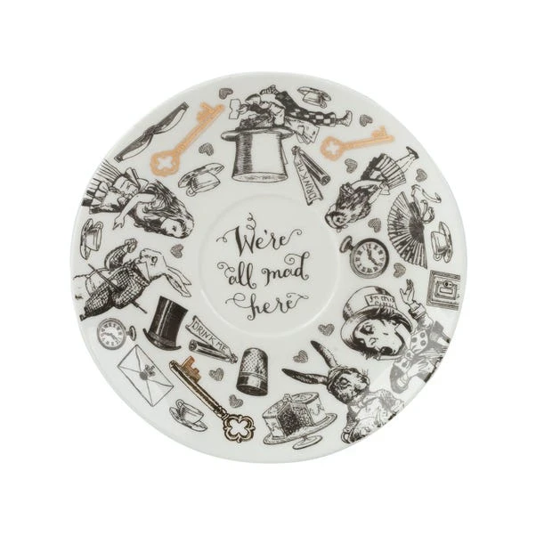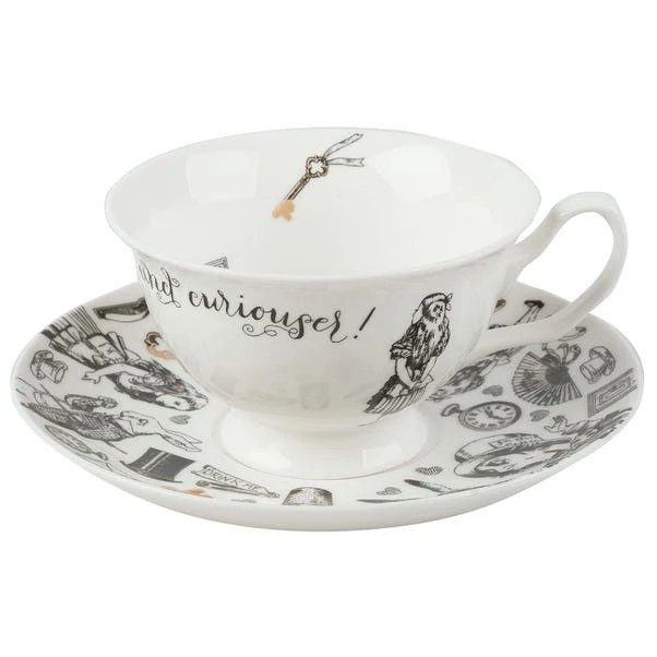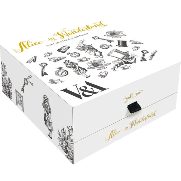 Step into a world of whimsy with this charming Alice in Wonderland teacup and saucer set. Decorated with vintage Wonderland scenes from the V&A archives, it features real gold highlights for a touch of luxury. The perfect size for a steaming cup of tea, it’s just the thing for enjoying your favourite brew. Lift the cup and discover the secret quote: “We’re all mad here”, hidden beneath – a delightful surprise for any Alice fan. Presented in an elegant gift box with a ‘Pull Me’ tab, it’s ready to give without the need for wrapping. Pair it with matching espresso cups or cake stands to complete your own Wonderland tea party.
