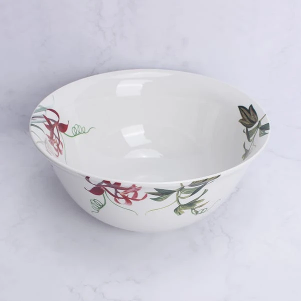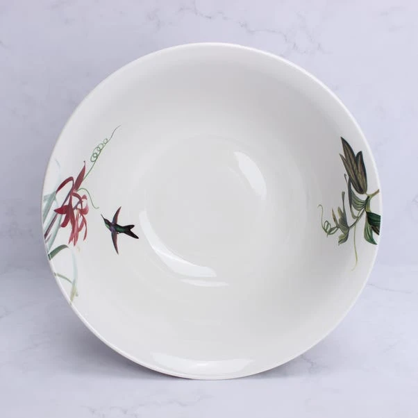 Serve your culinary creations in our Botanical Bird Serving Bowl, a generously sized porcelain bowl that adds a touch of sophistication to your dining table. Featuring an exquisite wrap-over decal inside, this serving bowl showcases the beautiful botanical bird and floral/leaf design. Dishwasher safe and complemented by matching items, it effortlessly enhances your dining experience, creating a cohesive and elegant table setting.