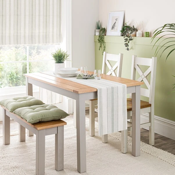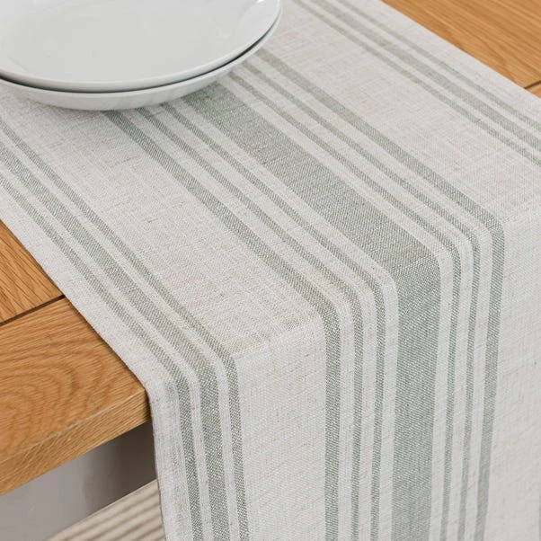 This table runner from our Churchgate range with its classic woven stripe design is the perfect addition to your table with tones of sage green harmoniously blending with the natural ground colour. Coordinating romans blinds in the same design available to buy separately.