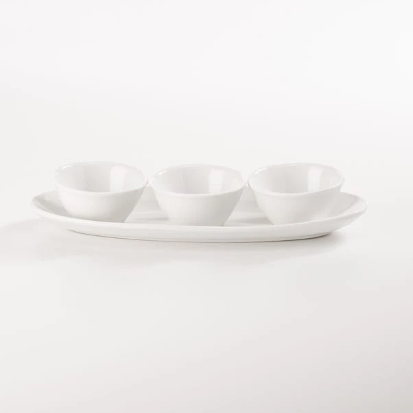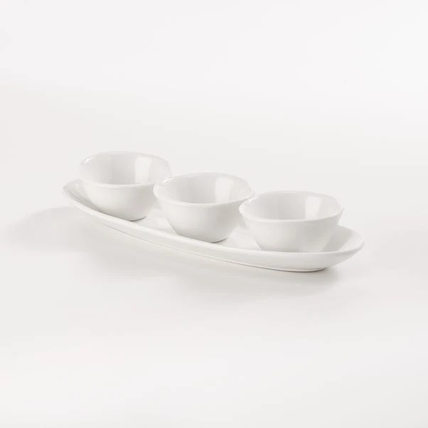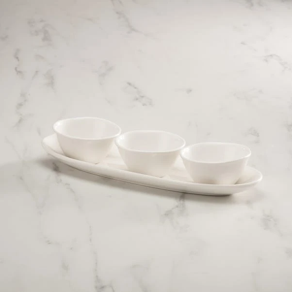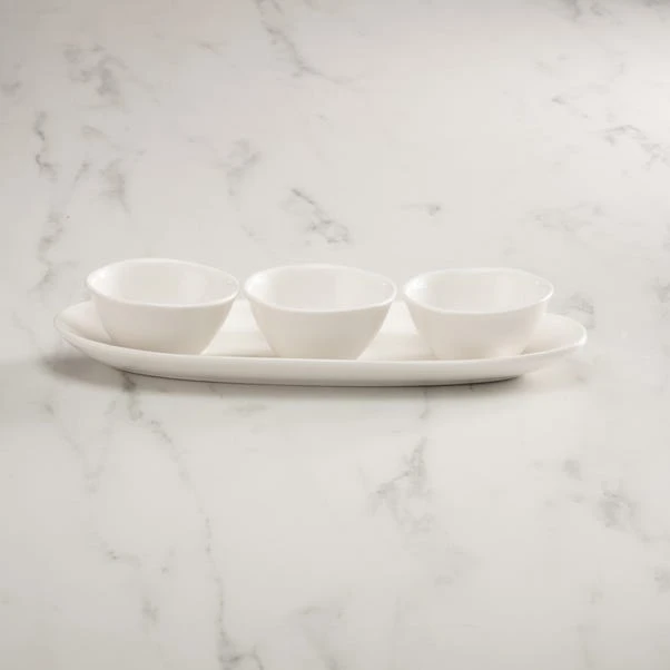 Bring an elegant and classic touch to your dinner table with the Dover White Tray and Dip Bowls. Beautifully crafted from fine New Bone China, this set features a stunningly finished, natural organic silhouette that’s timeless. The soft, organic design pairs perfectly with any dining room décor, making it perfect for casual meals or entertaining guests. Encased in a gorgeous glaze, this tray and dip bowl set is sure to steal the show that any dinner party. It’s dishwasher safe for easy cleaning and fridge safe for when you want to revisit those favourite dips for later. Whether serving nibbles or dips, this tray and bowl set brings effortless style to your table.