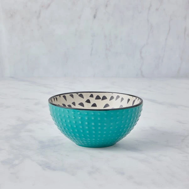 With a stylish dashed pattern and a spotted embossed outside, this bowl is the perfect contemporary addition to your kitchen or dining room table. With a colourful rim this bowl is perfect for adding a splash of colour to your table. Dishwasher safe this bowl is easy to clean. Other matching crockery is also available.