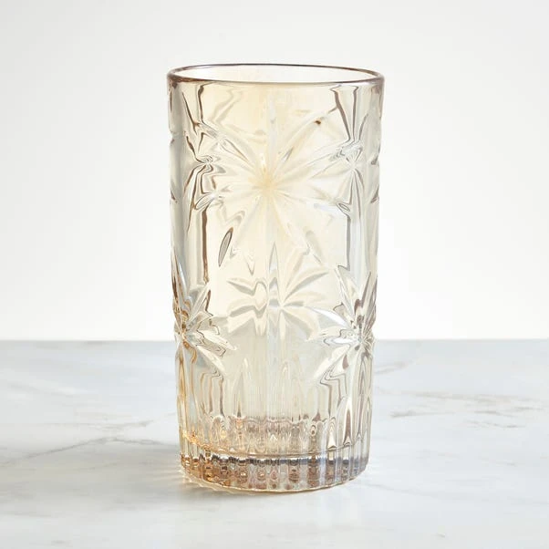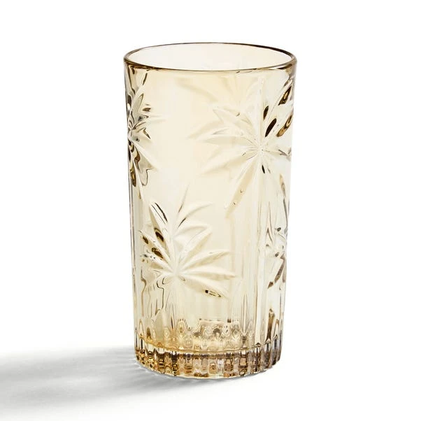This stunning amber highball glass with a luxe palm embossed design is the perfect piece to complement your dining table, looking simple yet stylish. Simply pop it in the dishwasher to clean. Wash before first use.