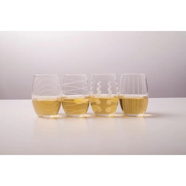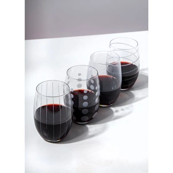Add a touch of elegance to your next gathering with the Mikasa Cheers Set of 4 Stemless Wine Glasses. Perfect for both semi-formal parties and casual get-togethers, each glass features a unique, precision-etched design, making it easy to identify your drink. The stemless shape means less chance of spills, so you can focus on enjoying your wine. Crafted from exquisite crystal glass with shimmering silver details, these glasses bring sophistication to any occasion. The wide bowl is ideal for bold reds, allowing your wine to breathe and release its full flavour.