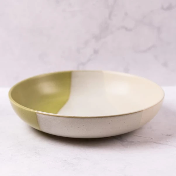 The Orsen pasta bowl features a distinctive dipped design, enriched by a blend of reactive and speckle glazes in various green shades. This modern dinnerware piece adds a contemporary touch to your table setting, culminating in a stylish finish. Crafted from stoneware, each bowl is unique due to the reactive glaze, enhancing the individualized charm of your dining experience. Additionally, this bowl is dishwasher and microwave safe, ensuring convenient maintenance.