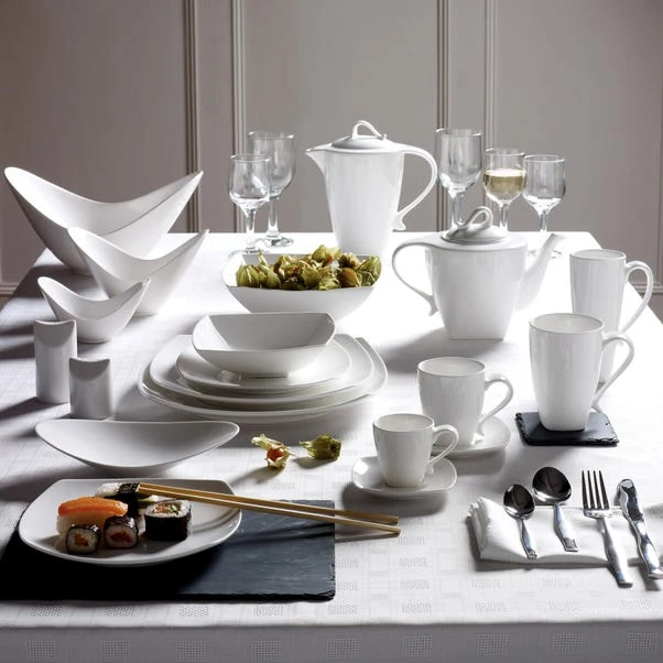 Made from fine china, this 16-piece dinner set features an elegant white finish and is suitable for convenient everyday eating. This set includes 4 mugs, dinner plates, side plates and bowls.