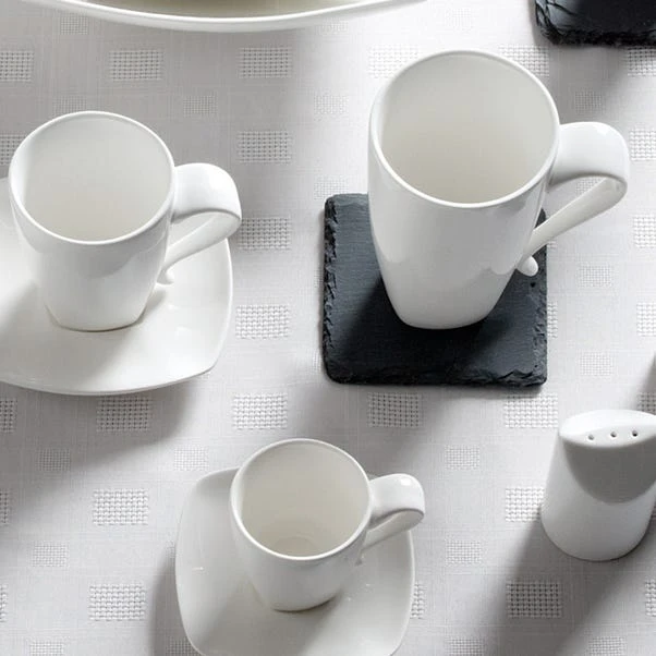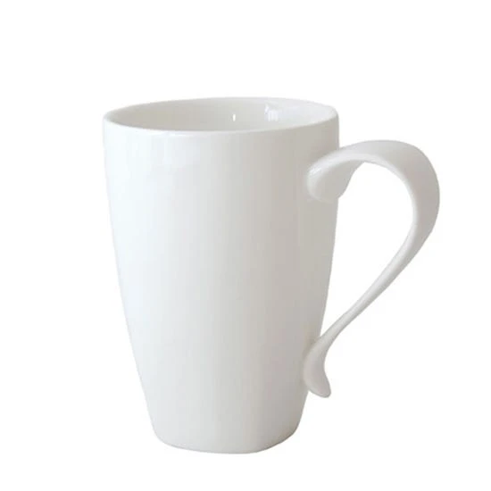 Crafted from durable fine china, this 10fl.oz white coffee mug features a curved handle and is microwave and dishwasher safe.