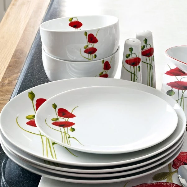 Crafted from durable porcelain with a gloss finish and featuring a design of poppies, this 12 piece dinner set comprising of 4 dinner plates, side plates and bowls is dishwasher and microwave safe.