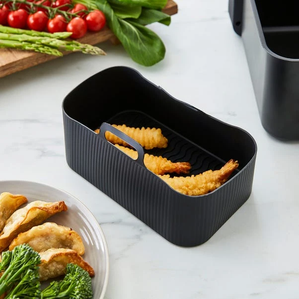 Meet the silicone air fryer tray in a sleek rectangle design. With the same easy cleaning, safe lifting handles, and multi-functionality, this tray fits seamlessly into your air fryer routine. Make cooking and cleaning a breeze with this kitchen essential.