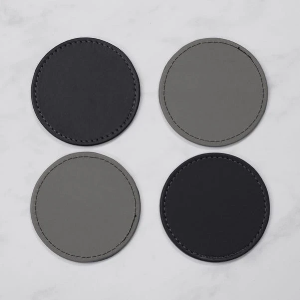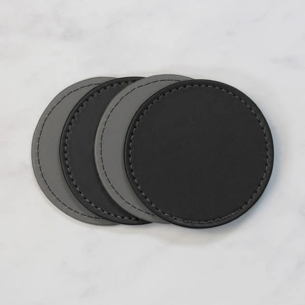 Minimalism meets luxury with this Set of 4 Black & Grey Faux Leather Reversible Round Coasters! Protect your surfaces in style with a sleek and sophisticated design that flips between classic black and modern grey. Heat resistant and easy to clean, they’re perfect for everyday use or elegant entertaining.