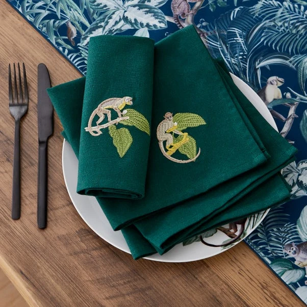 Elevate your dining experience with our set of 4 jungle luxe napkins, featuring green napkins adorned with cheeky monkey embroidery. With 2 designs per set and a recycled polycotton base, these napkins add a playful touch to your table setting.
