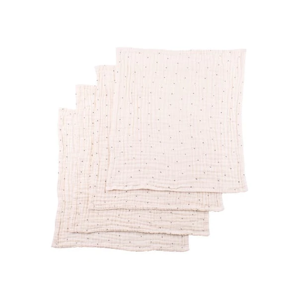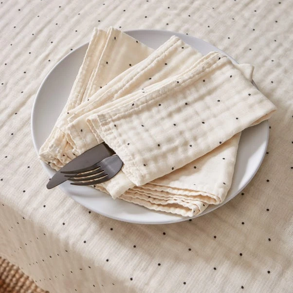 Add a touch of charm to your table setting with our set of 4 muslin dot napkins, lightweight cotton napkins adorned with printed muslin dots. Featuring a smart hemmed edge and packed with a grey ribbon, these napkins add a delightful texture to your dining experience.