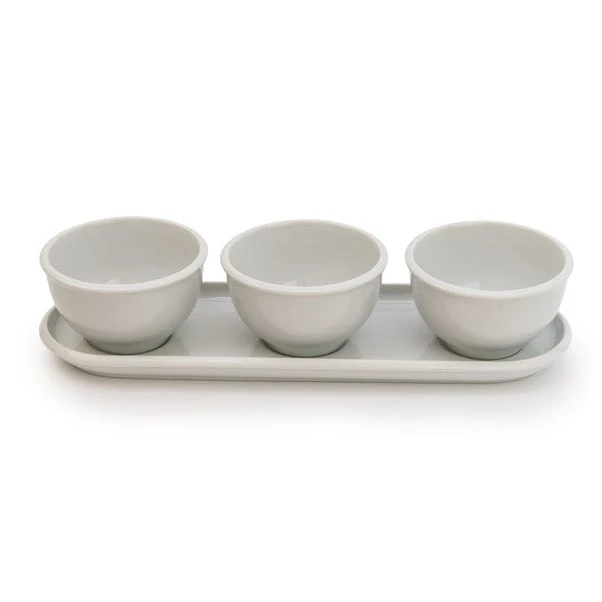 Add a subtle yet elegant touch to your dining collection with this classic white dip bowl set and platter. Beautifully crafted from porcelain this platter and dip bowl set is dishwasher safe and perfect for everyday or occasional use. This dip bowl set and the platter are the ideal essential for every home. Other matching dining accessories are also available.