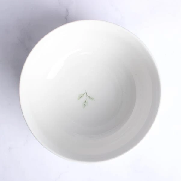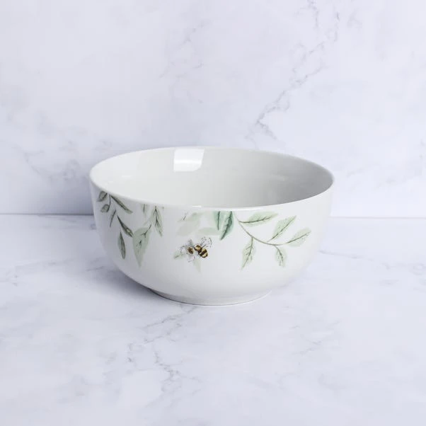 Start your day with the Willow Trail Sage Gloss Porcelain Cereal Bowl. This bowl showcases a delightful floral leaf and bee design in a soft sage colorway on a white base, offering casual elegance to your breakfast table. Made from durable porcelain, it can be paired with matching plates, pasta bowls, mugs, and dinner sets available separately.