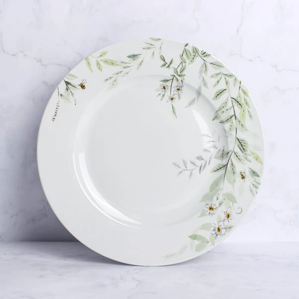 Enhance your dining experience with the Willow Trail Sage Gloss Porcelain Dinner Plate. This plate features a beautiful floral leaf and bee design in a soft sage colorway on a fresh white base. Made from high-quality porcelain, it adds a casual and natural elegance to any table. Complete your set with matching bowls, mugs, and dinner sets available separately.